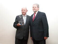 Walter Egger, Präsident der Internationalen Vereinigung des Feuerwehr- und Rettungswesens CTIF (links) erhält von Werner Neunzig, Geschäftsführer von Reader's Digest Deutschland den Pegasus Award