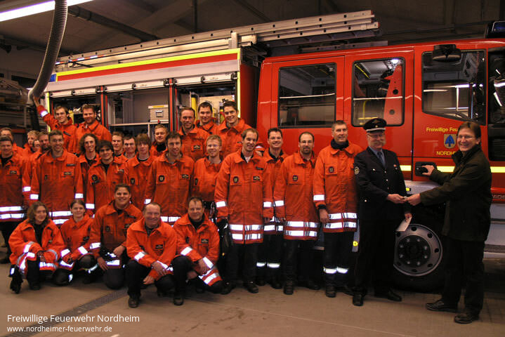 Im Anschluss an die diesjährige Jahreshauptübung der Freiwilligen Feuerwehr Nordheim durfte Bürgermeister Volker Schiek den Schlüssel für das neue Löschgruppenfahrzeug 10/6 an den Kommandanten Karl Wehler und seine Kameraden übergeben. Das knapp 250.000 Euro teure Fahrzeug erhöht die Schlagkraft der Nordheimer Feuerwehr erheblich. Dies konnte man schon bei mehreren Übungen und Einsätzen unter Beweis stellen, unter anderem bei einem Großbrand.